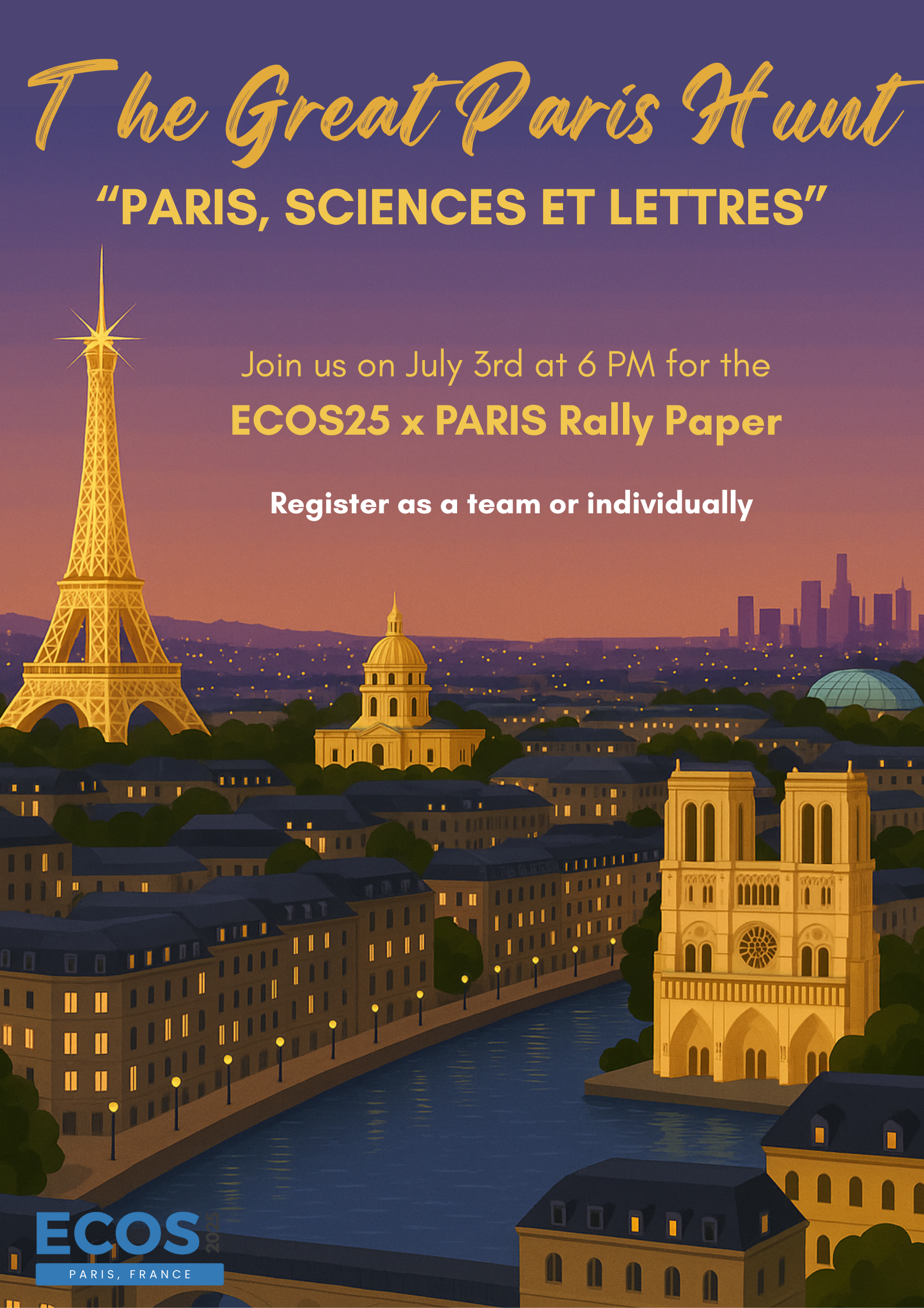 Join us for the ECOS 2025 Rally Paper City Hunt, an unforgettable adventure through the heart of Paris, specially crafted to bring participants together after a day of intense conference sessions! This high-energy social event combines fun, teamwork, and discovery, as teams race across the city solving clever clues, facing playful challenges, and uncovering the scientific, cultural, and historical gems of the City of Light.